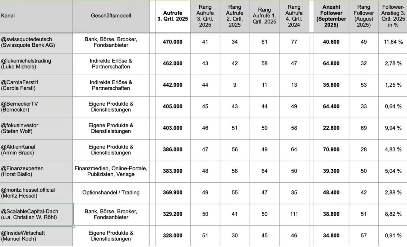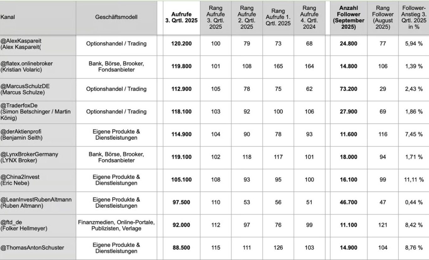 In der Aufstellung befinden sich die Top100-Kanäle, die schwerpunktmäßig Finanzcontent anbieten und die mehr als 10.000 Follower haben. Damit erhält die Anzahl Follower ein höheres Gewicht bei der Auswahl der Top100-Kanäle. Es erhalten damit Kanäle den Vorzug, die über eine längere Historie verfügen.