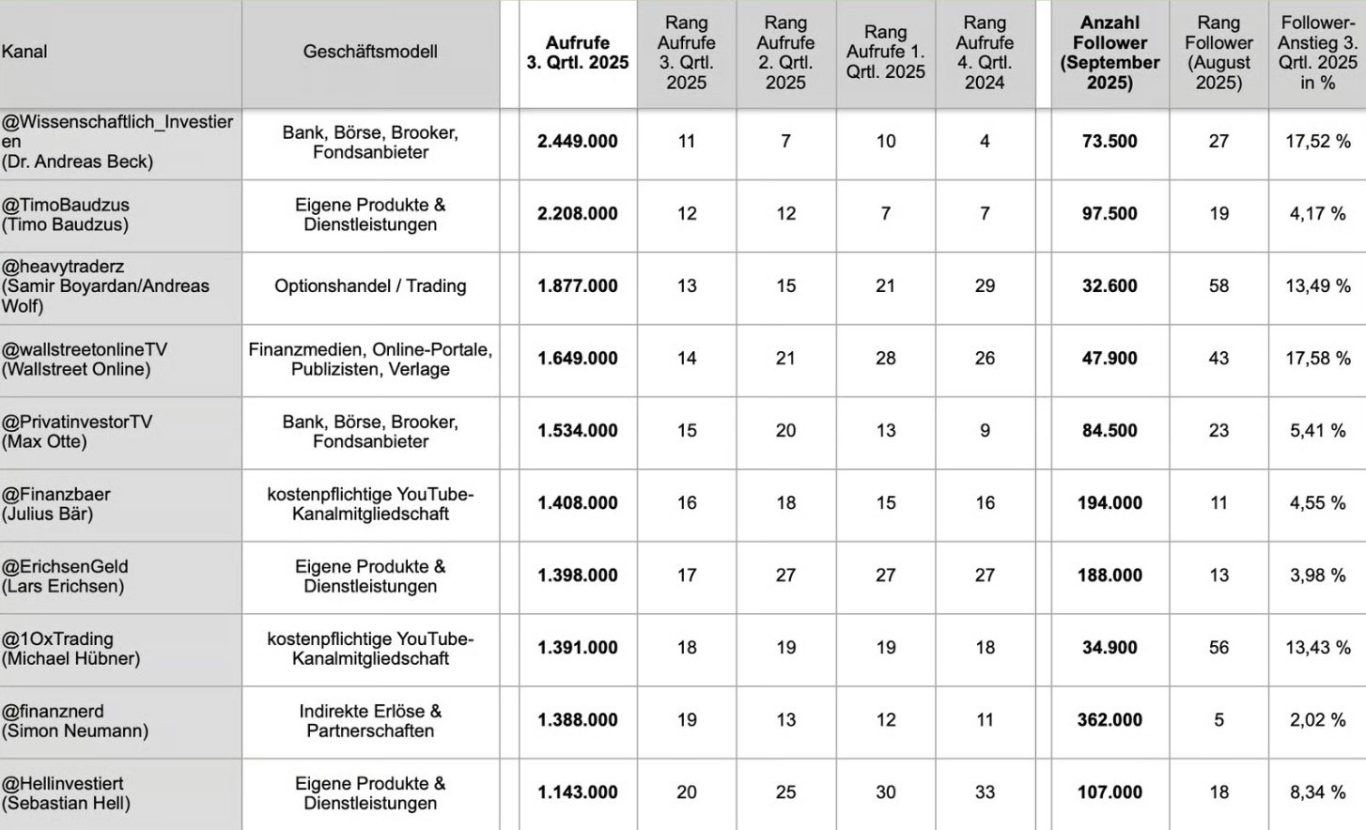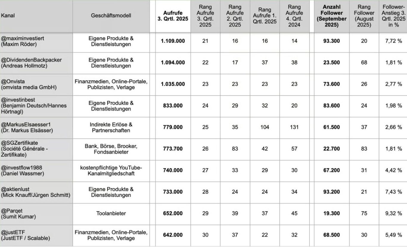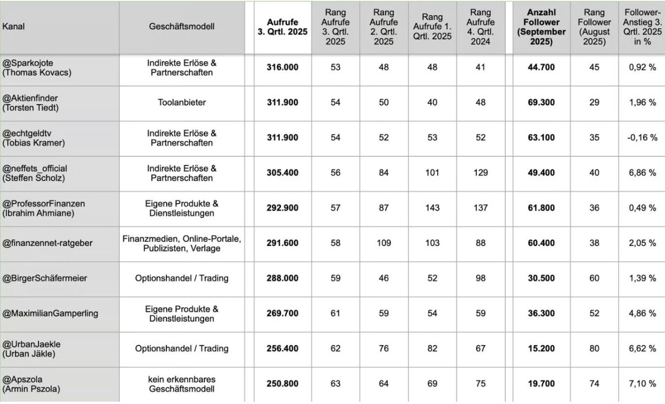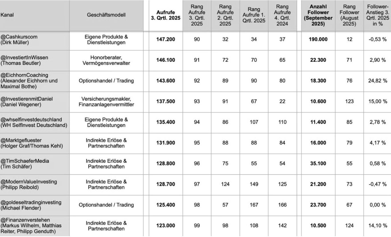 Ich habe bis Ende September ca. 300 YouTube-Kanäle identifiziert, die Finanzcontent produzieren. Veröffentliche werde ich auf der Webseite nur die hundert reichweitenstärksten Kanäle. Die vollständige Studie stelle ich gerne zur Verfügung.