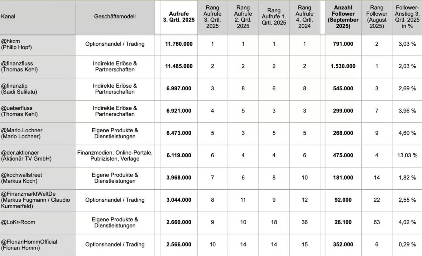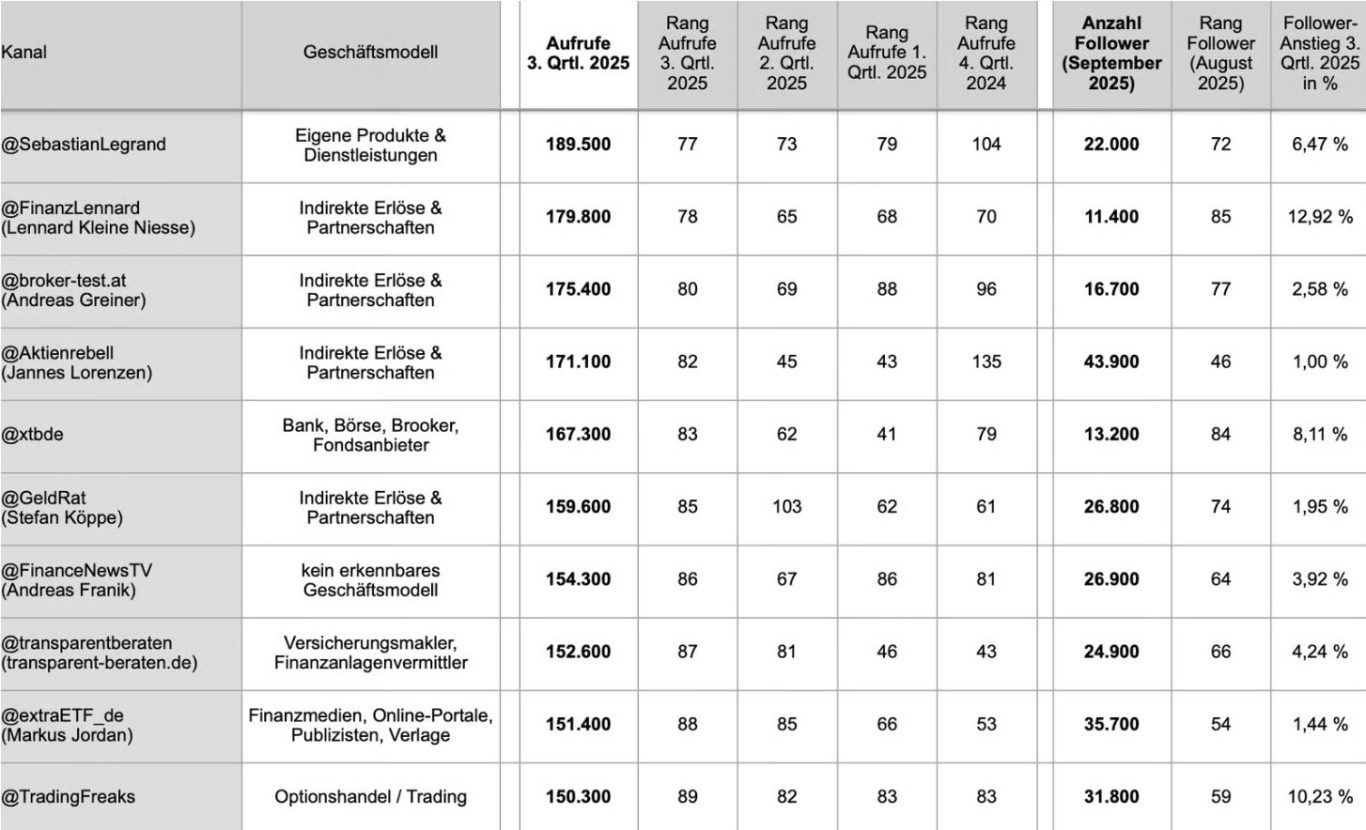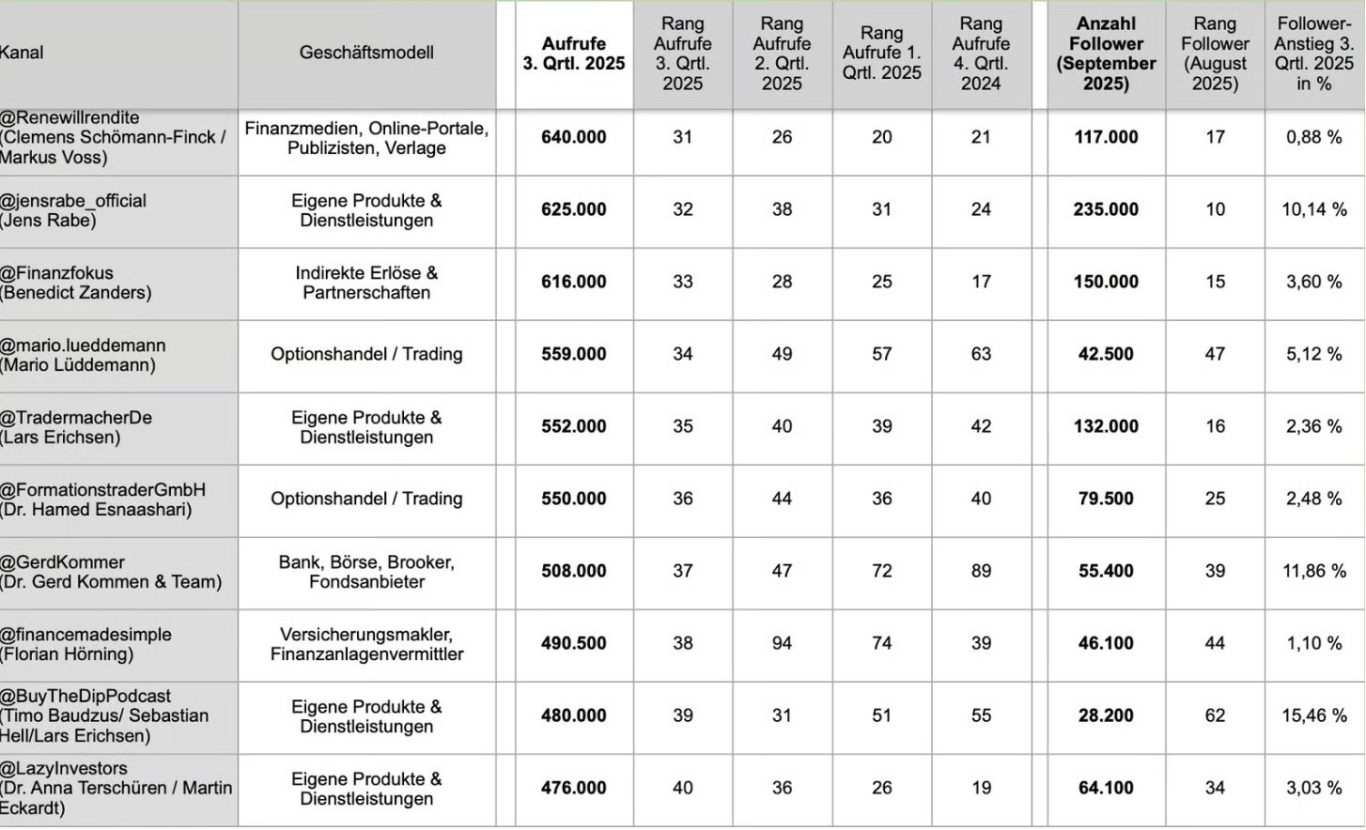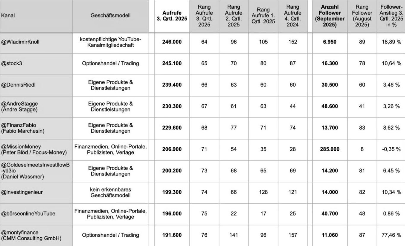 Ich habe bis Ende September ca. 300 YouTube-Kanäle identifiziert, die Finanzcontent produzieren. Veröffentliche werde ich auf der Webseite nur die hundert reichweitenstärksten Kanäle. Die vollständige Studie stelle ich gerne zur Verfügung.